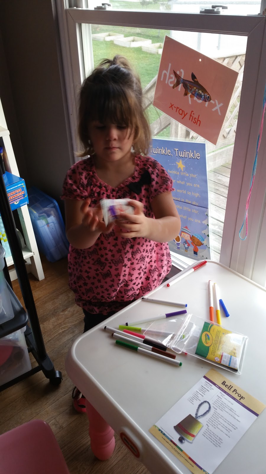 The children's creativity got to shine everywhere when they made the "Bell Prop". Markers worked very well for making designs on the bell. The got some practice with how they need to hold the marker. The "Bell Prop" some how became a trumpet too.